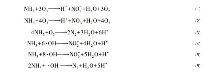 化學(xué)氧化法是一種重要的低溫除氨方法, 臭氧氧化法是其中之一.臭氧作為一種相對安全的消毒劑和氧化劑已被廣泛用于水處理中, 其對氨氮有一定的氧化能力(Singer et al., 1975), 且低溫時臭氧的溶解性和有效利用率較高, 因此, 臭氧氧化除氨有可能成為低溫化學(xué)除氨的一種有效途徑.O3及其產(chǎn)生的·OH與氨氮的反應(yīng)方程式分別如式(1)~(2)(Singer et al., 1975)和式(3)~(6)(Chen et al., 2018)所示.