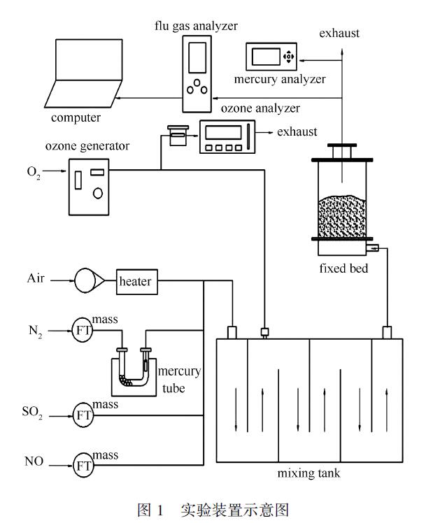 實(shí)驗(yàn)系統(tǒng)示意圖見圖1,主要由配氣系統(tǒng)、氣體混合罐、吸附床和檢測(cè)系統(tǒng)組成。配氣系統(tǒng):空壓機(jī)壓縮鼓出的空氣通過轉(zhuǎn)子流量計(jì)控制,使用管式爐進(jìn)行預(yù)熱調(diào)溫,使用質(zhì)量流量控制器控制N2、NO 和SO2 氣體,其中,N2 氣體用于吹脫汞管中汞蒸氣。使用溫度測(cè)試儀測(cè)定煙氣溫度。O2與臭氧發(fā)生器相連,產(chǎn)生一定濃度的臭氧氣體,通過其自帶的流量計(jì)控制流量并注入混合罐中與煙氣混合。
