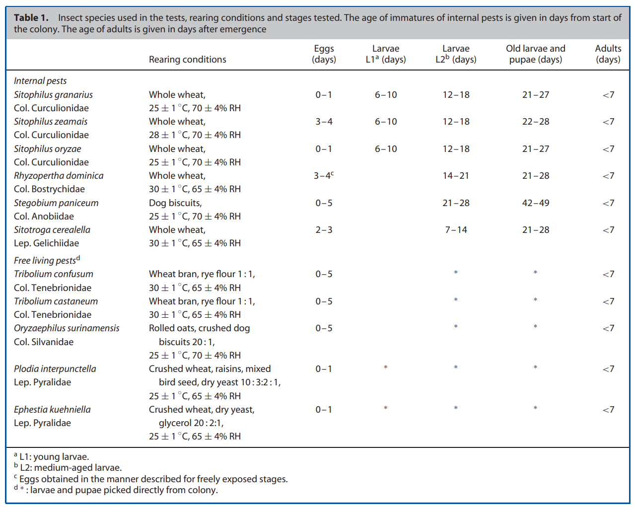 結果:自由暴露階段(除了少數例外)用 35 ppm 的臭氧控制 6 天。籽粒內的內部階段需要暴露在 135 ppm 的濃度下 8 天才能完全死亡。