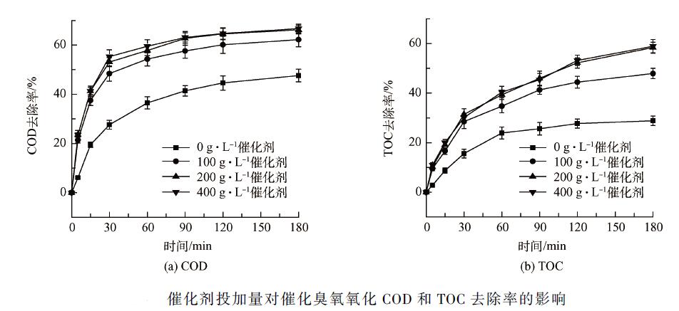 臭氧是有機物降解的直接動力,其投加量直接影響催化臭氧氧化的速率及效果。實驗通過調節所用臭氧發生器電流檔位改變臭氧投加量,并用碘量法測出臭氧產生量。廢水不調節pH 值(中性),催化劑投加量為200 g·L - 1 。由圖3 可知,不通臭氧,單純通空氣時,催化劑對廢水只有吸附作用,此時COD 和TOC 的去除率僅有(8. 6 ± 0. 3)% 和(12. 1 ± 0. 4)% 。增大臭氧投加量對COD 和TOC 的去除率的提有限,這可能與臭氧的利用率有關,有效利用的臭氧較少,但增大臭氧投加量,有利于三相界面的傳質,反應速率更快,特別是在短時間內效果顯著。