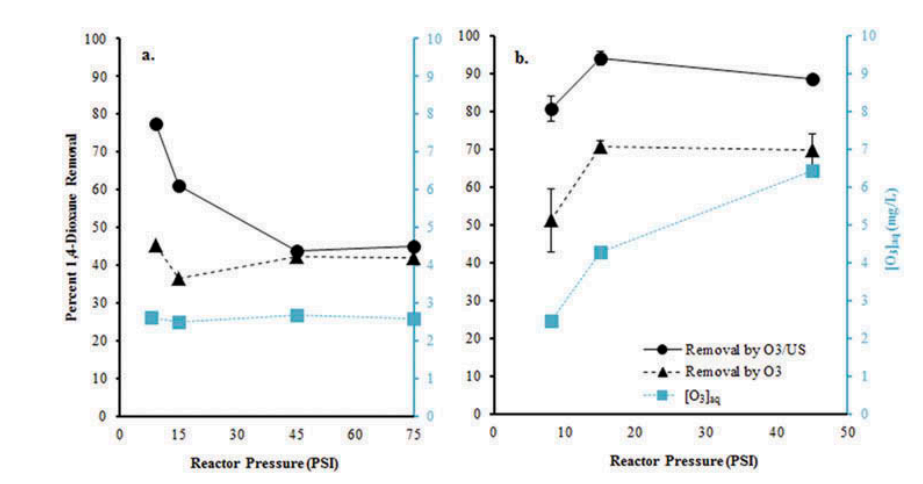 恒定水臭氧濃度的結(jié)果(圖4a.)表明,從臭氧中單獨去除二氧六環(huán)相對不受反應器壓力的影響。在反應器壓力(壓力表)從8到75磅/平方英寸(PSI)(0.55到5.2 bar)范圍內(nèi),單獨使用臭氧(2.5 mg/L)可產(chǎn)生約42%的二氧六環(huán)去除率。然而,在臭氧/超聲系統(tǒng)中,在低壓下獲得了顯著更高的去除率。隨著壓力的增加,協(xié)同作用逐漸減弱,在75 PSI(壓力表)時,聯(lián)合系統(tǒng)中二氧六環(huán)的去除趨向于臭氧系統(tǒng)中的去除。
